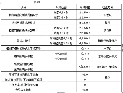 4.5.3.5 板材外观不应有缺棱、掉角、色斑、色线、坑窝等缺陷,板材不允许有裂纹。安装时,注意板面的平整度,垂直度,石材缝隙的垂直度和水平度要符合质量标准的要求。